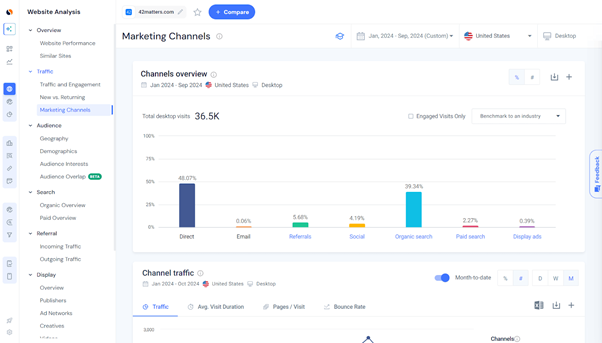 Сервис помогает быстро находить сайты, схожие по тематике и аудитории. Он показывает источники трафика — поиск, соцсети, переходы с других сайтов, — а также распределение по странам и вовлеченность посетителей.