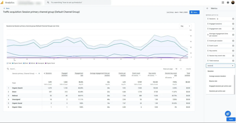 Важным показателем для анализа активности аудитории является метрика сеансов. В GA4 под сеансом понимается совокупность действий пользователя на сайте или в приложении, выполненных в течение определенного временного промежутка.