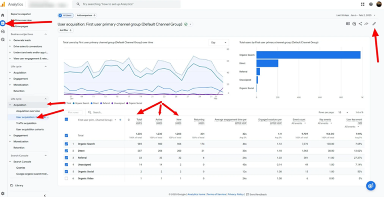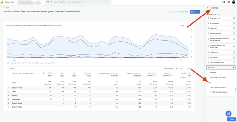 Платформа GA4 автоматически собирает информацию о пользователях, формирует полные отчеты. Получить доступ к данным, связанным с поведением и источниками посещаемости, можно в разделе «Метрики».
