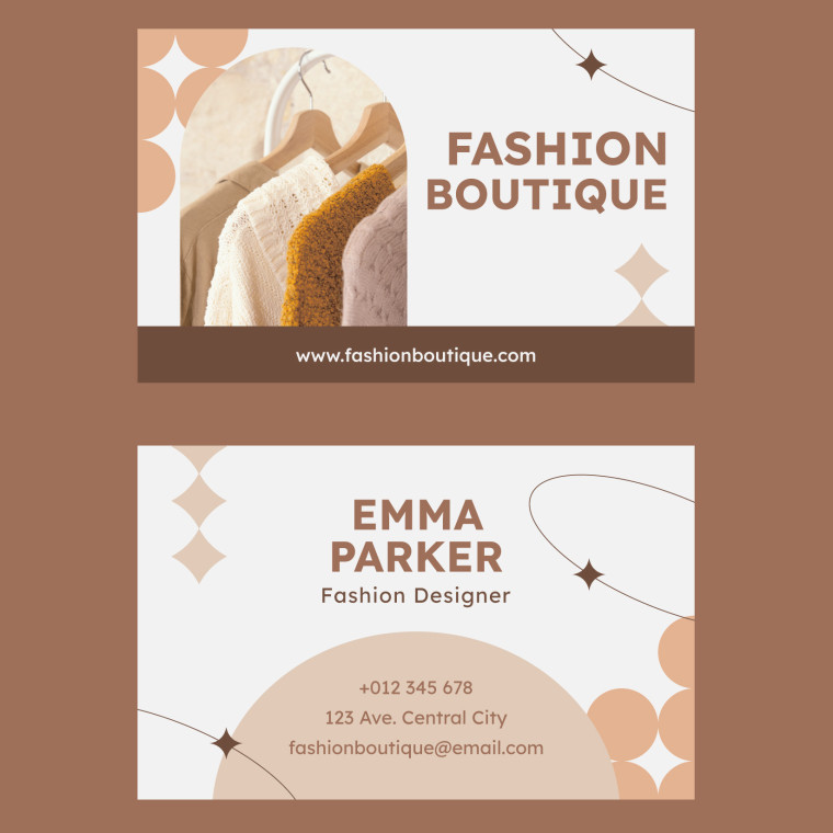 Визитка должна быть лаконичной и содержать самую важную информацию: название, логотип, адрес, телефон, соцсети. Если вам важно выделиться среди конкурентов, используйте креативный дизайн. Например, можно сделать визитки в форме миниатюрных вешалок или тканевых бирочек.