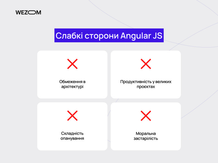 Обмеження в архітектурі. AngularJS був розроблений навколо патерну MVC/MVVM з використанням контролерів та $scope. Сучасні фреймворки використовують більш гнучкий та структурований компонентний підхід. Через застарілу архітектуру AngularJS було складно масштабувати та підтримувати, а його перехід на нові версії (міграція) залишається складним.