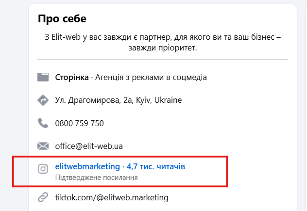Тільки розміщуйте посилання в розділах, які призначені для цього. У Facebook це можна зробити в описі профілю. Також обліковий запис Інстаграма зі сторінкою в FB можна зв'язати. Особливо варто виконати таку процедуру тим, хто хоче користуватись усіма можливостями рекламного кабінету Facebook.